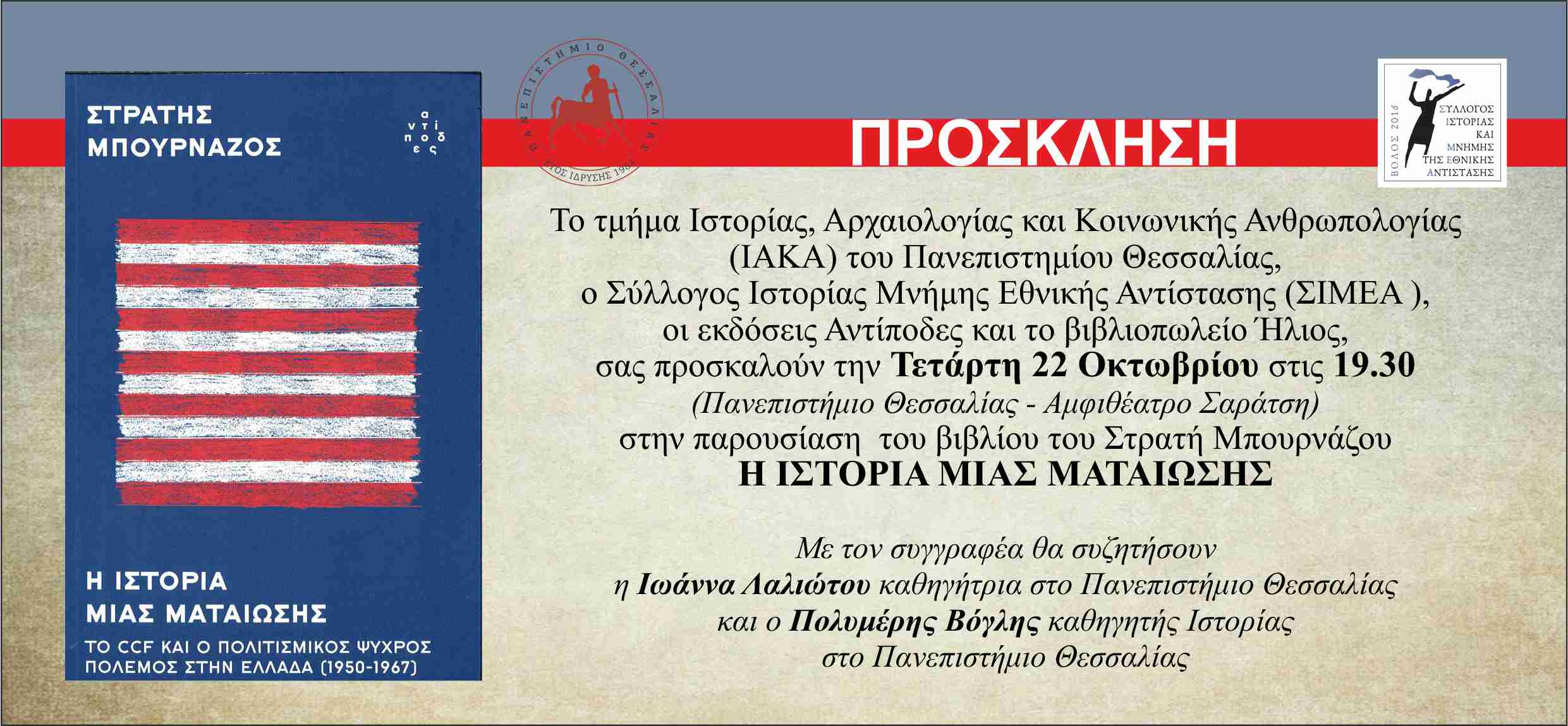 Το τμήμα Ιστορίας, Αρχαιολογίας, και Κοινωνικής Ανθρωπολογίας (ΙΑΚΑ) του Πανεπιστημίου Θεσσαλίας και ο Σύλλογος Ιστορίας Μνήμης Εθνικής Αντίστασης ( ΣΙΜΕΑ) προσκαλούν τον συγγραφέα του βιβλίου «Η Ιστορία μιας Ματαίωσης» Στρατή Μπουρνάζο, ο οποίος μαζί με τους καθηγητές ιστορίας του Πανεπιστημίου Θεσσαλίας, Ιωάννα Λαλιώτου και Πολυμέρη Βόγλη, θα παρουσιάσουν τις προσπάθειες του CCF να διεισδύσει στους πνευματικούς κύκλους της Ευρώπης και της Ελλάδας.