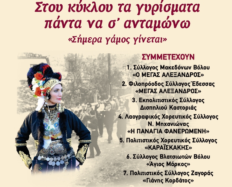 O Σύλλογος Μακεδόνων Βόλου «Ο ΜΕΓΑΣ ΑΛΕΞΑΝΔΡΟΣ» το Σάββατο 5 Mαϊου 2018 και ώρα 19:30 στο Πολιτιστικό Κέντρο Ν. Ιωνίας , διοργανώνει εκδήλωση – μουσικοχορευτική παράσταση «Στου κύκλου τα γυρίσματα πάντα να σ΄ ανταμώνω» με τη συμμετοχή και άλλων συλλόγων με ζωντανή μουσική και τραγούδι.