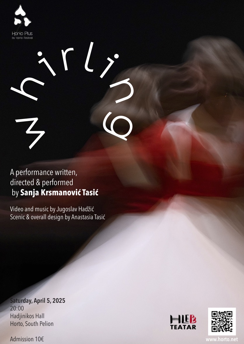 Η παράσταση «Whirling – Sanja Krsmanović Tasić»- Παράσταση χοροθεάτρου με μία ερμηνεύτρια θα παρουσιαστεί στο Χόρτο, στην αίθουσα «Γιώργος Χατζηνίκος» του Κοινωφελούς Ιδρύματος “Γ. Αγγελίνης – Πία Χατζηνίκου” το Σάββατο 5 Απριλίου στις 20:00. Η είσοδος είναι 10 ευρώ.