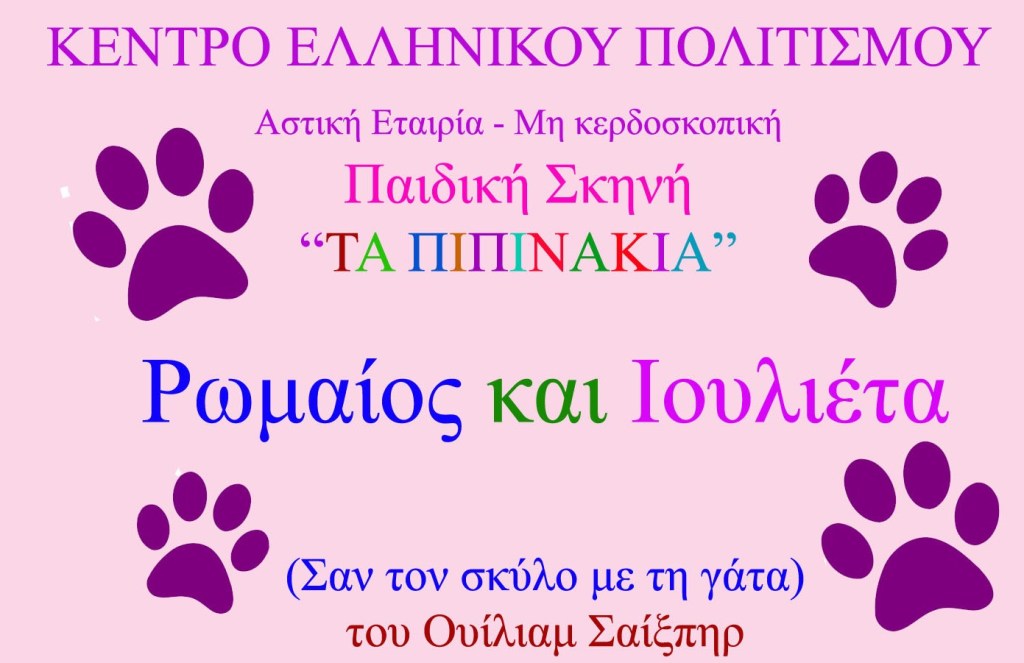 Αγάπη – Έρωτας- Συμφιλίωση- Αντιρατσισμός, ζωντανεύουν στην παιδική μας σκηνή μέσα από τον υπέροχο μύθο του μεγάλου μας Ουίλιαμ Σαίξπηρ “Ρωμαίος και Ιουλιέτα” σε διασκευή του υπέροχου Γιάννη Καλατζόπουλου. Οι ήρωες μετατρέπονται σε ζωάκια, γάτες και σκύλους. Είναι πιο κοντινή η προσέγγιση στα μηνύματα του έργου για τα παιδιά. Οι εχθρικές οικογένειες των Μοντέγων και Καπουλέτων θέλουν με κάθε τρόπο να χωρίσουν τα δυο παιδιά, Ρωμαίο και Ιουλιέτα. Κι έτσι ξεσπά ένας φοβερός γατο-σκυλοκαβγάς μέσα από κωμικές καταστάσεις. Στο τέλος όμως θα θριαμβεύσει η Αγνή αγάπη, η Συμφιλίωση και η Ειρήνη. Όλα αυτά με τραγούδια και χορό. Μια ευκαιρία να περάσουμε μηνύματα αισιοδοξίας και χαράς στους μικρούς μας φίλους. Χριστίνα Στόγια…