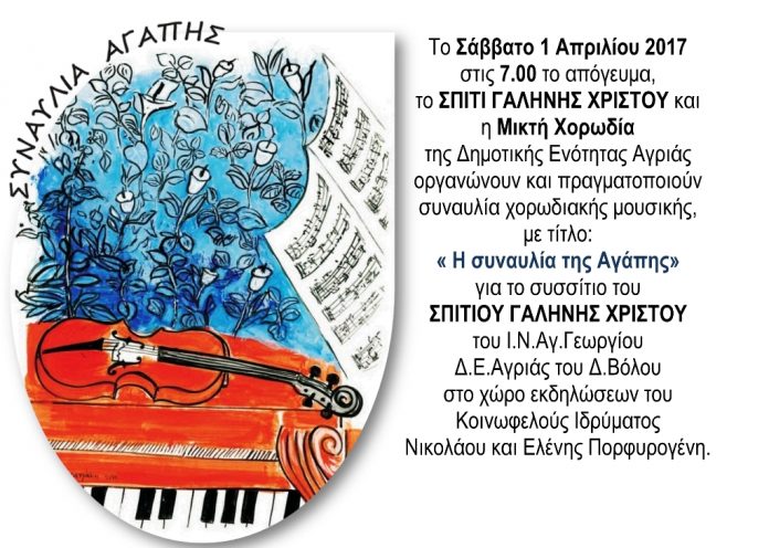 Το Σάββατο 1 Απριλίου 2017 στις 7 το απόγευμα, το Σπίτι Γαλήνης Χριστού και η «Μικτή Χορωδία» της Δημοτικής Ενότητας Αγριάς, οργανώνουν και πραγματοποιούν συναυλία χορωδιακής μουσικής, με τίτλο: «Η συναυλία της Αγάπης» για το συσσίτιο του «Σπιτιού Γαλήνης» του Ι.Ν. Αγ. Γεωργίου Δ.Ε.Αγριάς του Δ.Βόλου, στο χώρο εκδηλώσεων του Κοινωφελούς Ιδρύματος Νικολάου και Ελένης Πορφυρογένη.