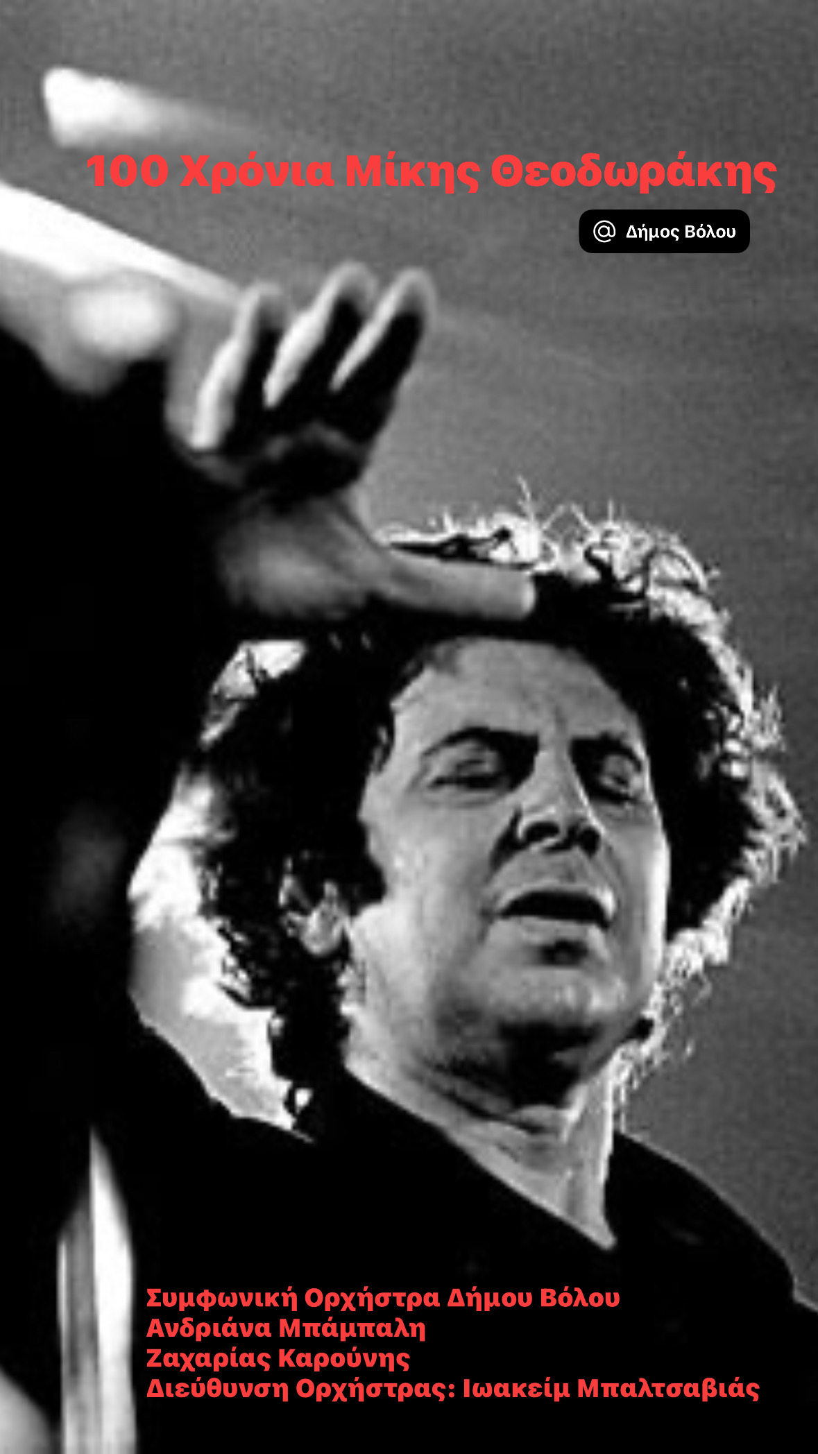Η Συμφωνική Ορχήστρα Δήμου Βόλου τιμά τα 100 χρόνια από τη γέννηση του Μίκη Θεοδωράκη με μια μεγάλη συναυλία–αφιέρωμα με τίτλο «Μίκης Θεοδωράκης- Μουσική Ελευθερίας», την Κυριακή 26 Οκτωβρίου στις 20:00, στο Δημοτικό Θέατρο Βόλου.