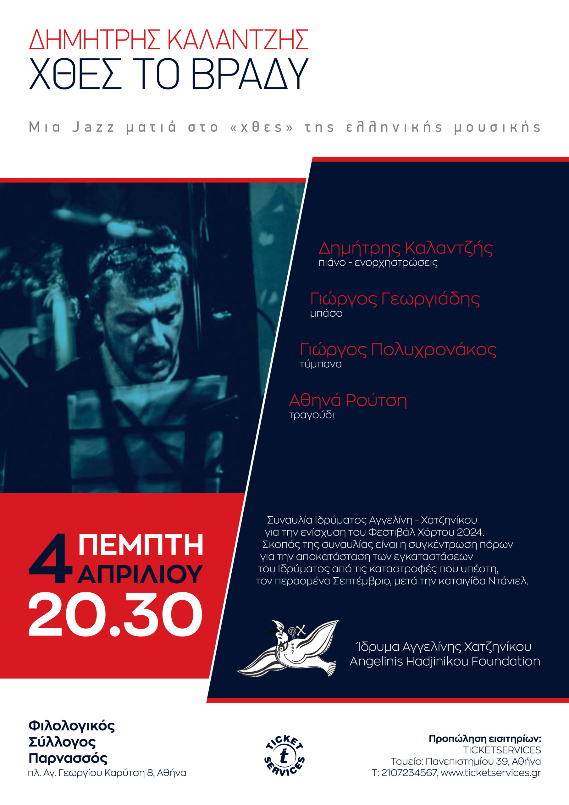 Ο Φιλολογικός Σύλλογος Παρνασσός διοργανώνει μουσική βραδιά στην Αθήνα με τον Δημήτρη Καλαντζή με τίτλο «Χθες το βράδυ» προκειμένου να στηρίξει το Ίδρυμα Αγγελίνη- Χατζηνίκου και να ενισχύσει το Φεστιβάλ Χόρτου 2024, καθώς οι εγκαταστάσεις του υπέστησαν ζημιές μετά τις καταστροφικές πλημμύρες του περασμένου Σεπτεμβρίου.