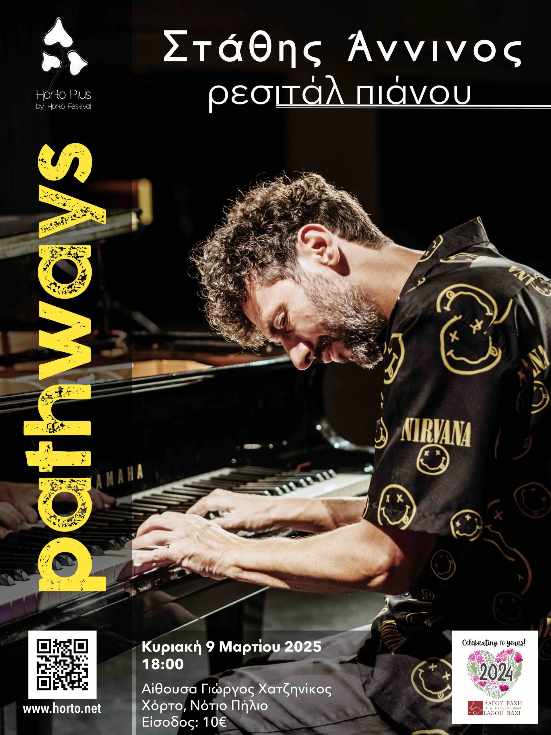 Ο χαρισματικός πιανίστας και συνθέτης Στάθης Άννινος, θα βρεθεί στο Χόρτο, όπου την Κυριακή 9 Μαρτίου στις 18:00 θα δώσει συναυλία στην αίθουσα «Γιώργος Χατζηνίκος» στο Ίδρυμα «Γ. Αγγελίνης – Πία Χατζηνίκου”. Ο καλλιτέχνης είναι γνωστός γιατί δημιουργεί μουσικά μονοπάτια που γεφυρώνουν την κλασική παράδοση του πιάνου με τον αυτοσχεδιασμό.
