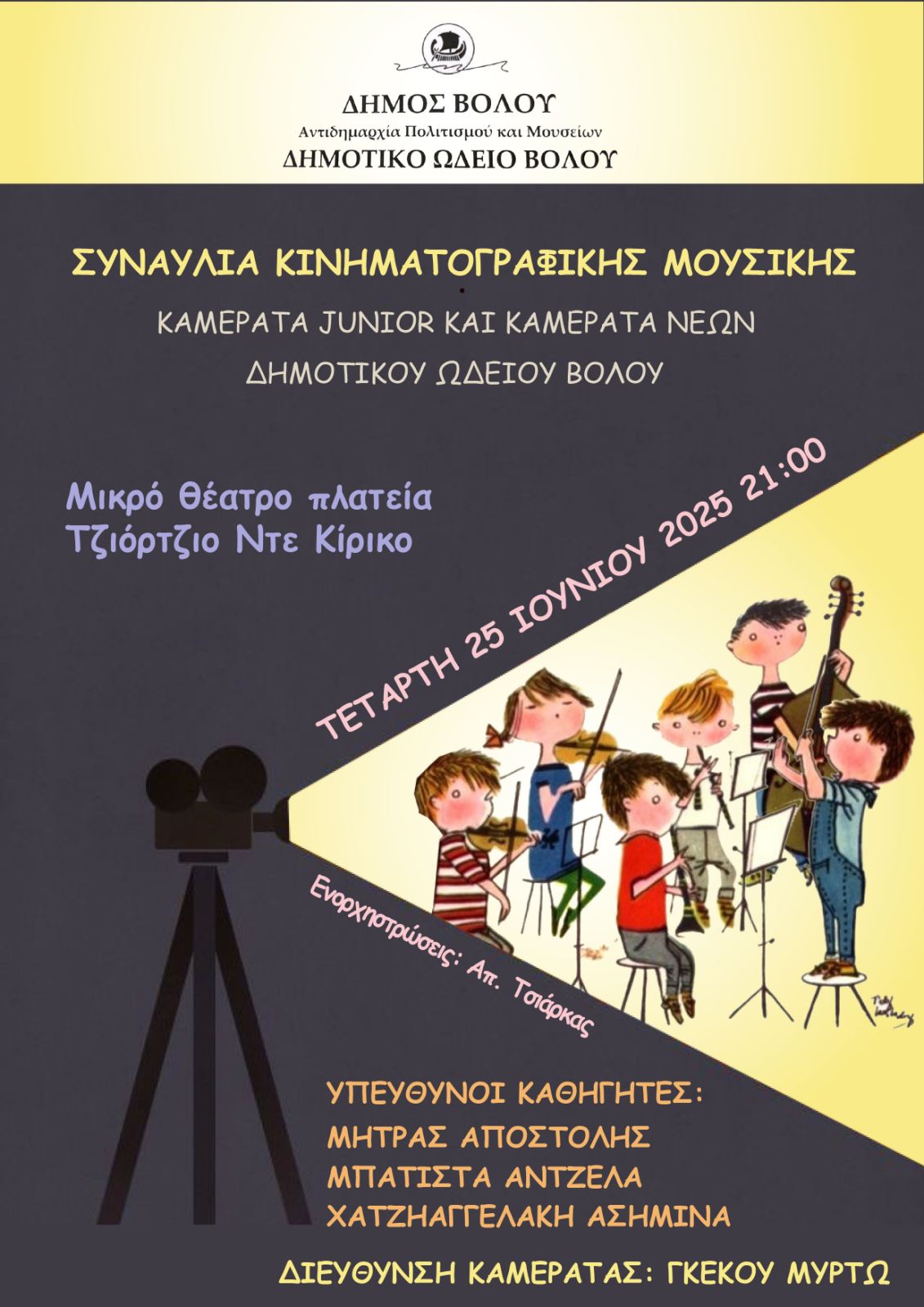 Στις 9,00 το βράδυ της Τετάρτης 25 Ιουνίου 2025, το Δημοτικό Ωδείο Βόλου, “ανοίγει την πόρτα του” και βγαίνει στο θεατράκι έξωθεν του Ωδείου, για να παρουσιάσει με την Καμεράτα Junior και την Καμεράτα Νέων, Κινηματογραφική Μουσική. Με υπεύθυνους καθηγητές τους Αποστόλη Μητρά, Άντζελα Μπατίστα και Ασημίνα Χατζηαγγελάκη, οι σπουδαστές του Ωδείου δούλεψαν επάνω σε κινηματογραφικές συνθέσεις που θα αποδώσουν για το κοινό τους, σε ενορχηστρώσεις Απόστολου Τσιάρκα.