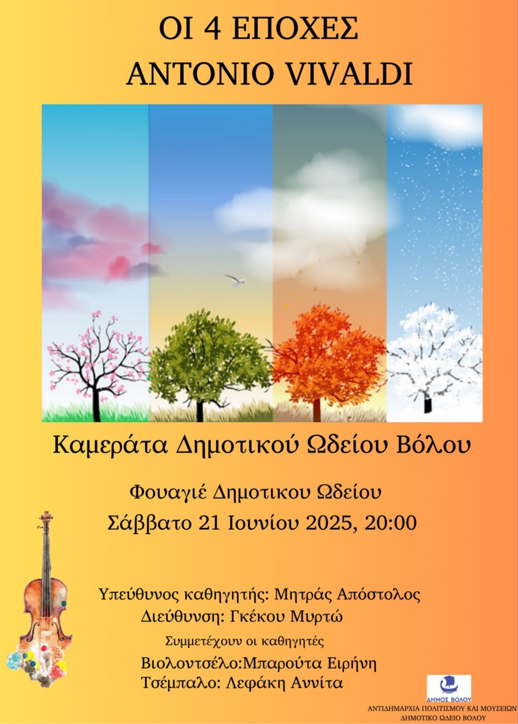 Στις 8.00 το βράδυ του Σαββάτου, στου Φουαγιέ του Δημοτικού Ωδείου, η Καμεράτα των Σπουδαστών του ΔΩΒ με υπεύθυνο καθηγητή τον Αποστόλη Μητρά, παρουσιάζει τις 4 ΕΠΟΧΕΣ του Antonio Vivaldi. Στη συναυλία συμμετέχουν οι καθηγητές Ειρήνη Μπαρούτα (βιολοντσέλο) και Αννίτα Λεφάκη (τσέμπαλο). Την Καμεράτα διευθύνει η Μυρτώ Γκέκου.
