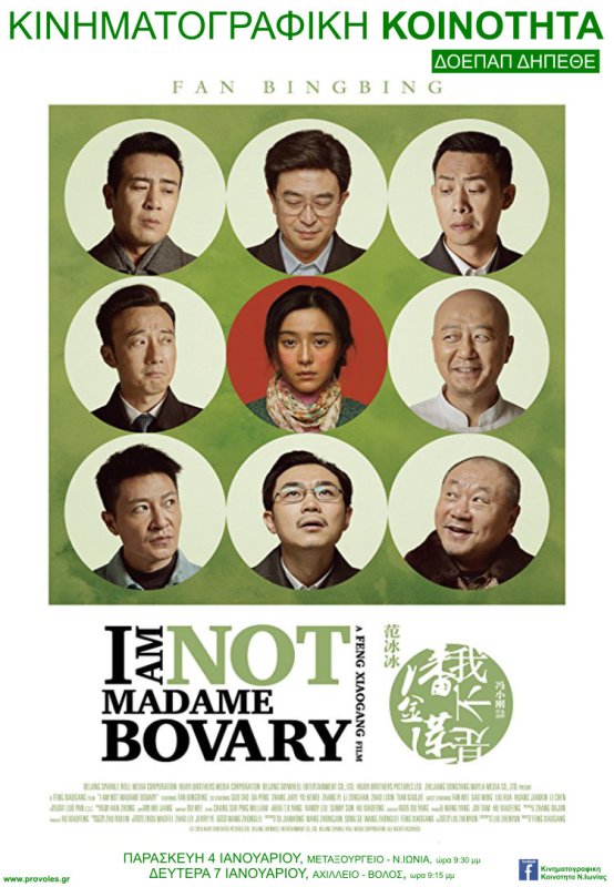 «Δεν Είμαι η Μαντάμ Μποβαρύ», «I’m not Madame Bovary», Κίνα, 2016. Σκηνοθεσία: Ζιαογκάνγκ Φενγκ. Σενάριο: Ζενγιούν Λιου. Πρωταγωνιστούν: Μπινγκμπίνγκ Φαν, Τάο Γκούο, Πενγκ Ντα. Διάρκεια: 129 λεπτά/