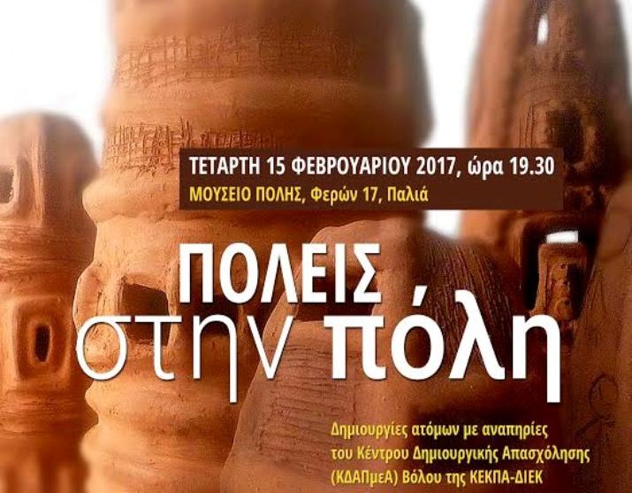 Συνεχίζεται στο Μουσείο της Πόλης στα Παλιά (Φερών 17) η έκθεση «Πόλεις στην Πόλη». Πρόκειται για μια εικαστική εγκατάσταση με δημιουργίες ατόμων με αναπηρίες του ΚΔΑΜμεΑ της ΚΕΚΠΑ – ΔΙΕΚ του Δήμου Βόλου, βασισμένες στα βιώματά τους για την πόλη.