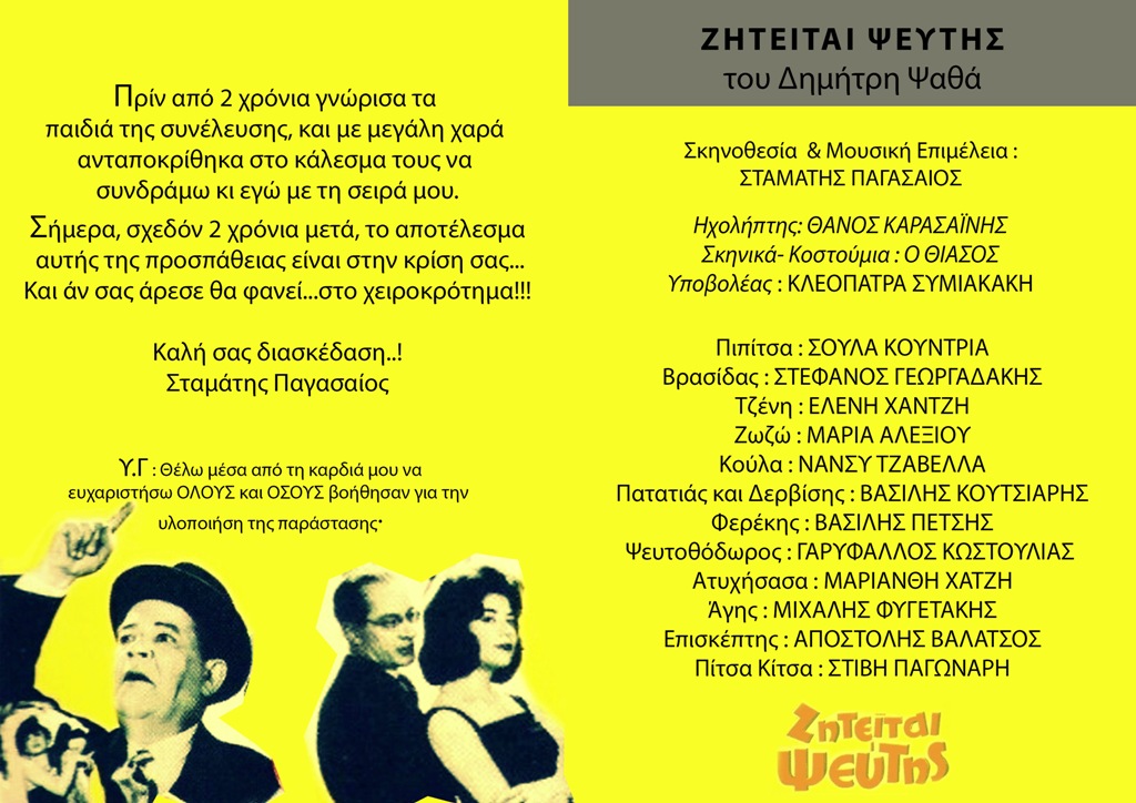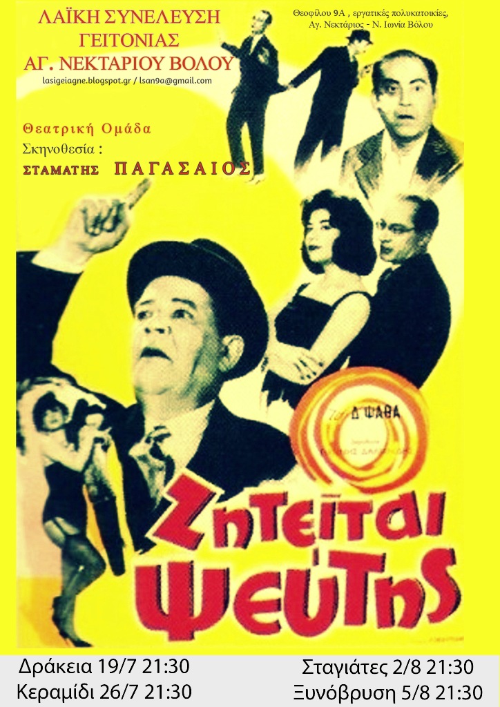 Η Θεατρική Ομάδα της Λαϊκής Συνέλευσης Αγ. Νεκταρίου, μετά τις πετυχημένες παραστάσεις στη Δράκεια και το Κεραμίδι, συνεχίζει την περιοδεία του έργου “Ζητείται Ψεύτης” σε σκηνοθεσία του Σ. Παγασαίου.