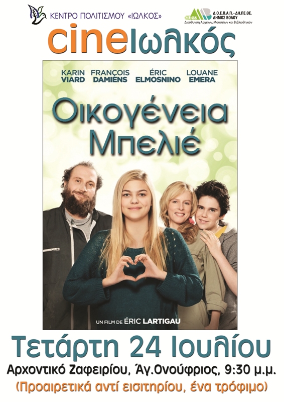 Σήμερα Τετάρτη 24 Ιουλίου 2019 και ώρα 9.30 μ.μ θα προβληθεί η ταινία « Οικογένεια Μπελιέ» γαλλική ταινία, σκηνοθεσία Ερίκ Λαρτιγκό με τους: Καρίν Βιάρ, Φρανσουά Νταμιέν, Ερίκ Ελμοσνινό, Λουάν Εμερά.