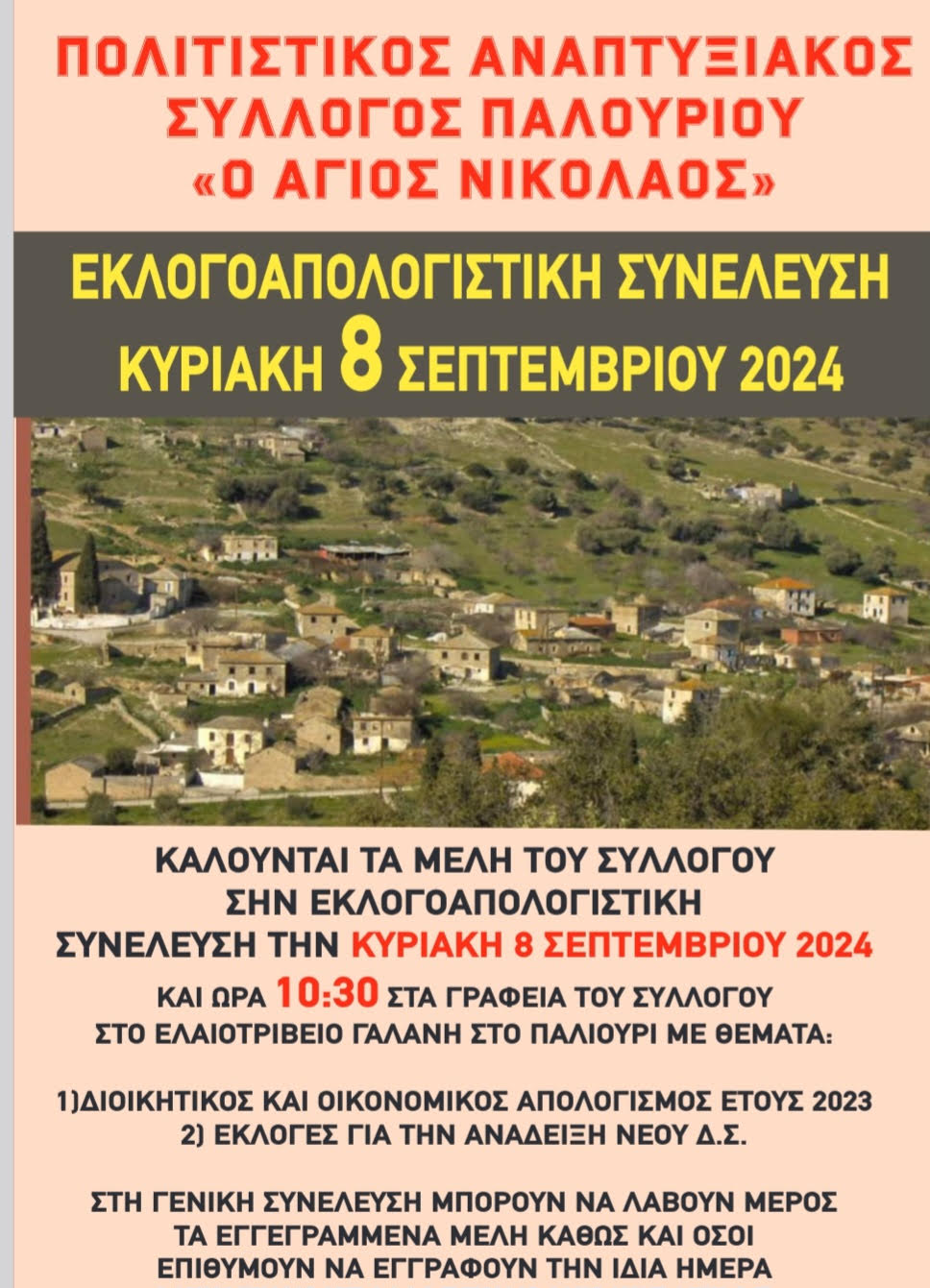 Εκλογοαπολογιστική συνέλευση θα πραγματοποιήσουν την Κυριακή 8 Σεπτεμβρίου τα μέλη του Πολιτιστικού, Αναπτυξιακού Συλλόγου Παλιουρίου «Άγιος Νικόλαος» στα γραφεία του Συλλόγου στις 10.30 το πρωί.