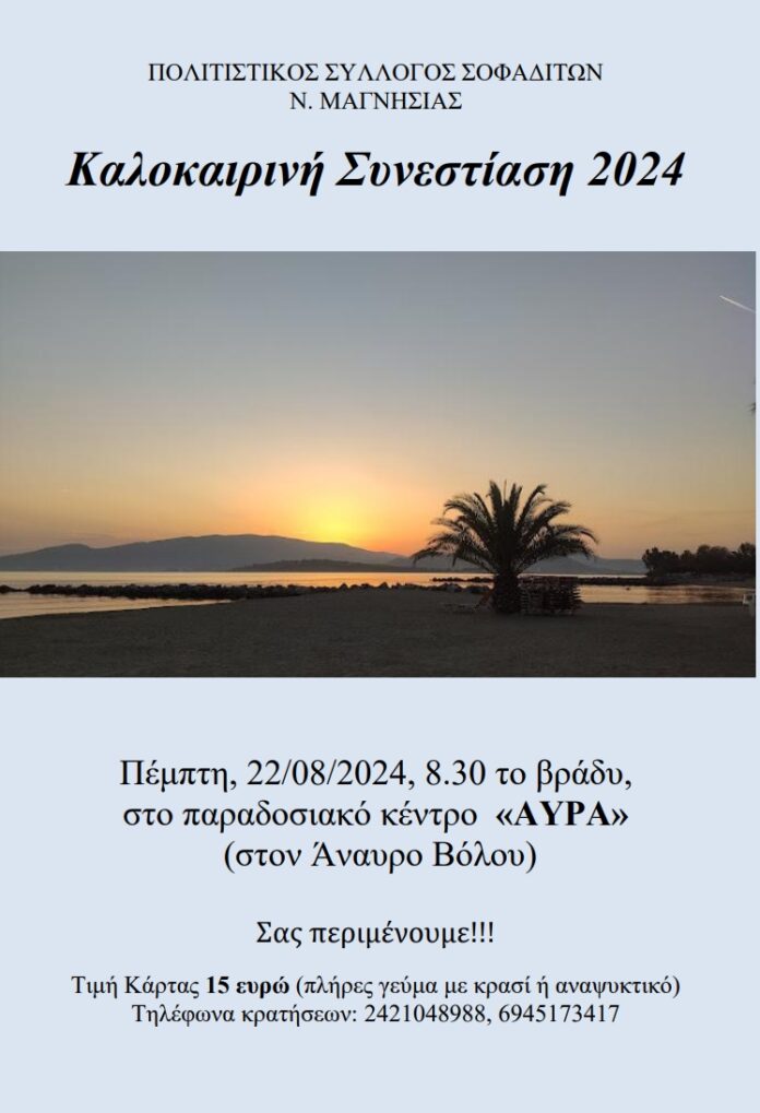 Ο Πολιτιστικός Σύλλογος Σοφαδιτών Ν. Μαγνησίας καλεί τα μέλη και τους φίλους του σε μια ξεχωριστή βραδιά στην παραδοσιακή ταβέρνα «Αύρα», (στον Άναυρο), την Πέμπτη, 22 Αυγούστου, στις 8.30 το βράδυ.