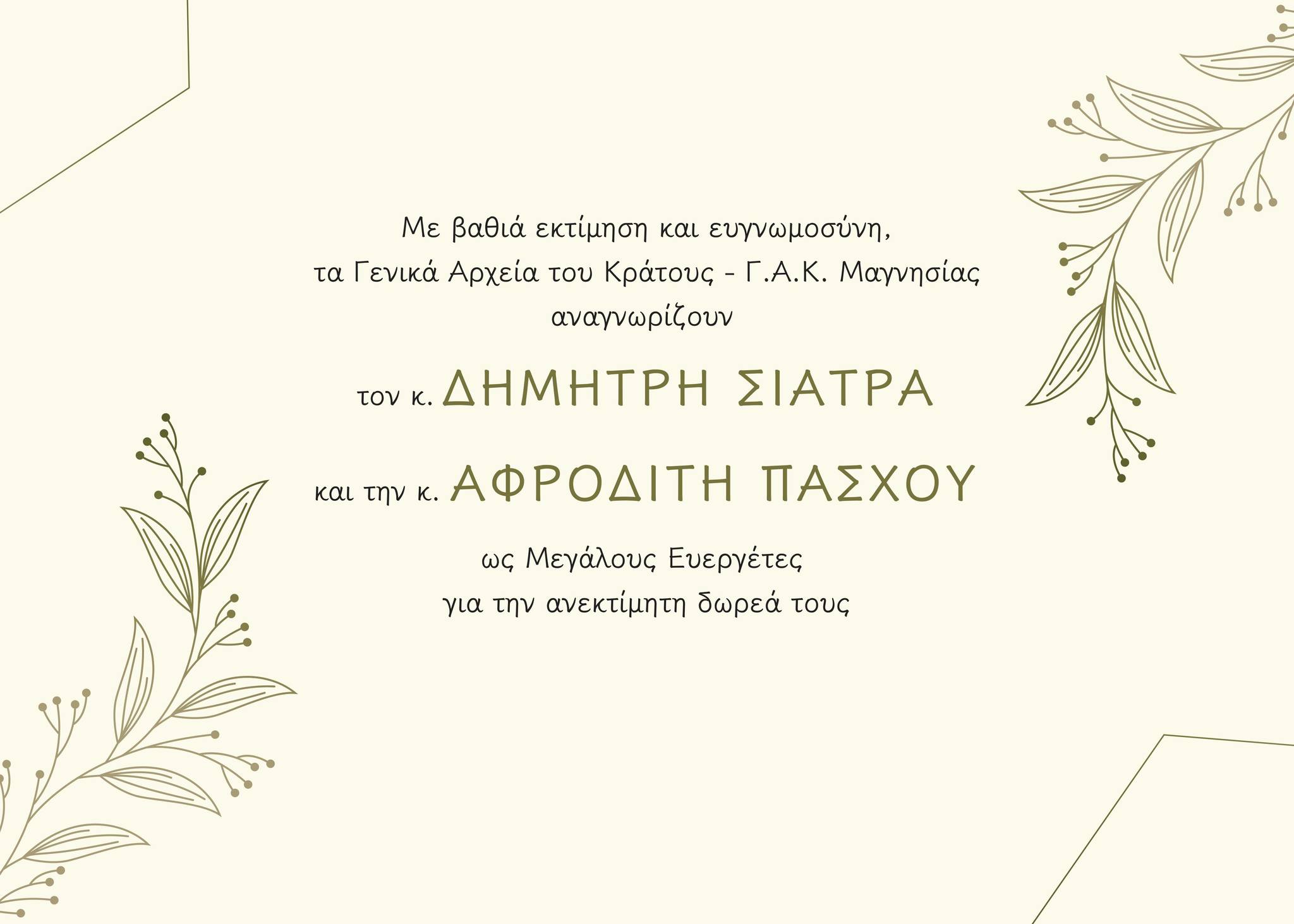 Στις 11 Ιουνίου, στη διάρκεια της έκθεσης για τον Μαγνησιώτικο Ευεργετισμό, τα ΓΑΚ Μαγνησίας τίμησαν δύο πρόσφατους δωρητές τους και όσοι βρέθηκαν στην λιτή, αλλά ουσιαστική αυτή εκδήλωση εξέφρασαν τη βαθιά τους συγκίνηση και ευγνωμοσύνη.