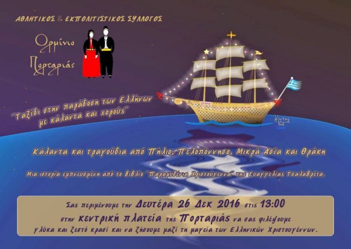 Εορταστικές εκδηλώσεις προγραμματίζει ο «Αθλητικός και Εκπολιτιστικός Σύλλογος Πορταριάς “Το Ορμίνιο”, με τον τίτλο ΄΄Ταξίδι στην παράδοση των Ελλήνων με κάλαντα και χορούς΄΄.