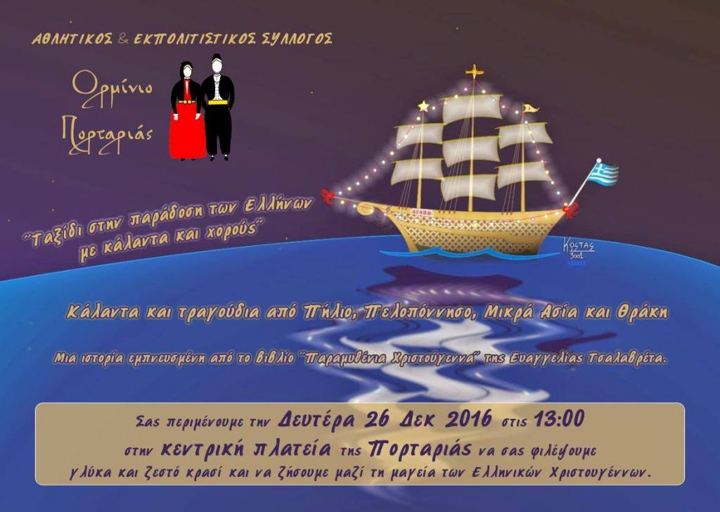 Σας περιμένουμε την Δευτέρα 26 Δεκ 2016 στις 13:00 στην κεντρική πλατεία της Πορταριάς, να σας φιλέψουμε γλύκα και ζεστό κρασί και να ζήσουμε μαζί τη μαγεία των Ελληνικών Χριστουγέννων».