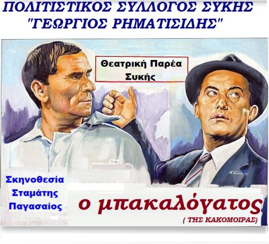 Η «Θεατρική Παρέα του Πολιτιστικού Συλλόγου Συκής» ΄΄Γεώργιος Ρηματισίδης’’ μετά την μεγάλη επιτυχία του ΄΄ΜΠΑΚΑΛΟΓΑΤΟΥ΄΄ στην πρεμιέρα της Δράκειας την Τετάρτη 6 Ιουλίου, συνεχίζει την περιοδεία της και ξαναχτυπά αυτή την φορά ΄΄εντός έδρας!