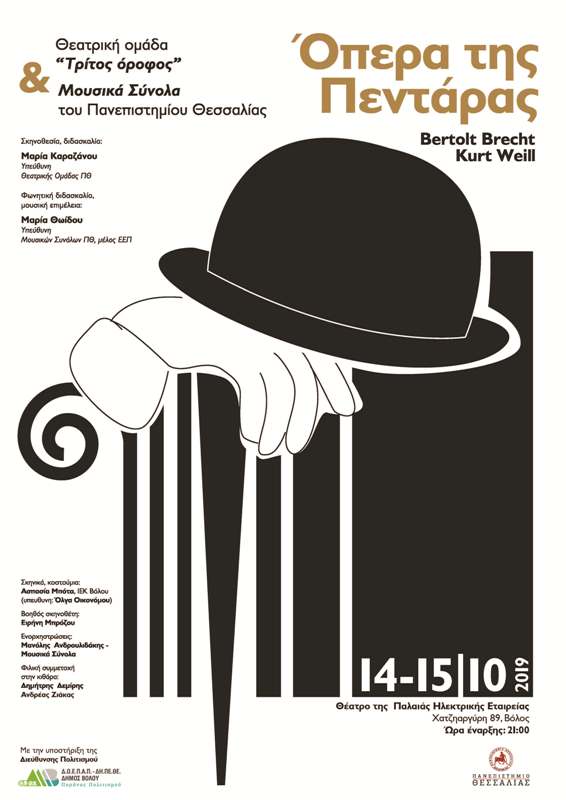 Τη Δευτέρα 14 και την Τρίτη 15 Οκτωβρίου 2019 στις 21:00, στο Θέατρο της Παλαιάς Ηλεκτρικής Εταιρείας (Χατζηαργύρη 89), στο Βόλο, η Θεατρική Ομάδα «Τρίτος Όροφος» σε συνεργασία με τα Μουσικά Σύνολα του Πανεπιστημίου Θεσσαλίας παρουσιάζουν το έργο του Μπέρτολτ Μπρεχτ «Η Όπερα της Πεντάρας», με την υποστήριξη της Διεύθυνσης Πολιτισμού του Δ.Ο.Ε.Π.Α.Π – ΔΗ.ΠΕ.ΘΕ Δήμου Βόλου.