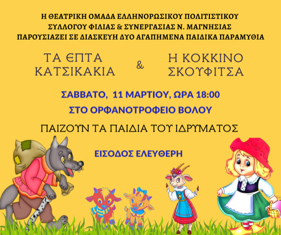Η θεατρική ομάδα Ελληνο-Ρωσικού Πολιτιστικού Συλλόγου Φιλίας & Συνεργασίας ν. Μαγνησίας παρουσιάζει όπως αναφέρεται σε σχετική ανακοίνωση, «σε διασκευή δυο αγαπημένα παιδικά παραμύθια «Τα επτά κατσικάκια» & «Η Κοκκινοσκουφίτσα». Στην παράσταση για εσάς παίζουν τα παιδιά του Ορφανοτροφείου Βόλου. Το Σάββατο, 11 Μαρτίου, στις 18:00 στο Ορφανοτροφείο Βόλου (2ας Νοεμβρίου, 10, πλησίον Ι.Ν. Αγ. Παντελεήμονα). Σας περιμένουμε όλους! Η είσοδος ελεύθερη».
