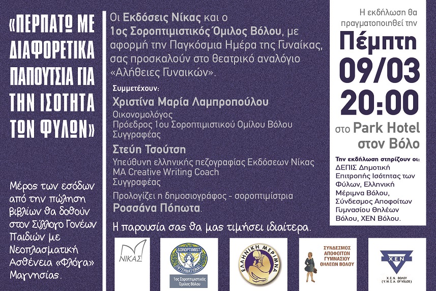 «Αλήθειες Γυναικών» είναι ο τίτλος εκδήλωσης που διοργανώνουν ο 1ος Σοροπτιμιστικός Όμιλος Βόλου και ο Εκδοτικός Οίκος «Νίκας» την Πέμπτη 9 Μαρτίου στις 8 το βράδυ στο “Park Hotel” στον Βόλο στο πλαίσιο της Παγκόσμιας Ημέρας της Γυναίκας.