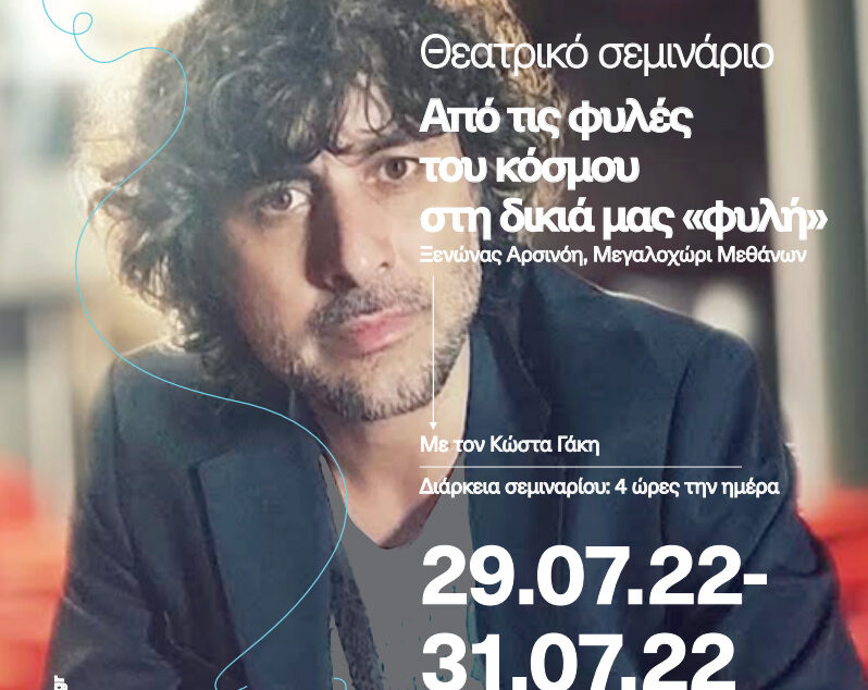 Στις 29-31 Ιουλίου 2022, ο Κώστας Γάκης και ο εκπαιδευτικός και πολιτιστικός φορέας Καθετή πραγματοποιούν τριήμερο θεατρικό σεμινάριο «Από τις φυλές του κόσμου στη δική μας “φυλή”». Θέμα του σεμιναρίου θα είναι η «φυλή» και οι ιστορίες φυλών του κόσμου. Η ομάδα θα επεξεργαστεί θεατρικά ιστορίες από φυλές όλου του κόσμου. Το σεμινάριο απευθύνεται σε ηθοποιούς, μη ηθοποιούς, εκπαιδευτικούς και γενικά σε όποια και όποιον αγαπά τις ιστορίες και την ανθρώπινη ζεστασιά. Θα πραγματοποιηθεί στον ξενώνα Αρσινόη, στο Μεγαλοχώρι Μεθάνων και θα έχει διάρκεια τέσσερις ώρες την ημέρα.