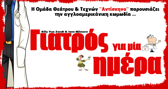 Η Ομάδα Θεάτρου & Τεχνών ¨Αντίσκηνο¨ παρουσιάζει την αγγλοαμερικάνικη κωμωδία των Billy Van Zandt & Jane Milmore,¨Γιατρός για μια ημέρα¨. Την Παρασκευή 14, Σάββατο 15, Κυριακή 16 & Δευτέρα 17 Ιουλίου 2017, στην Πλατεία Κυλινδρά (Άλλη Μεριά). Ώρα Έναρξης 21.30 και με είσοδο ελεύθερη.