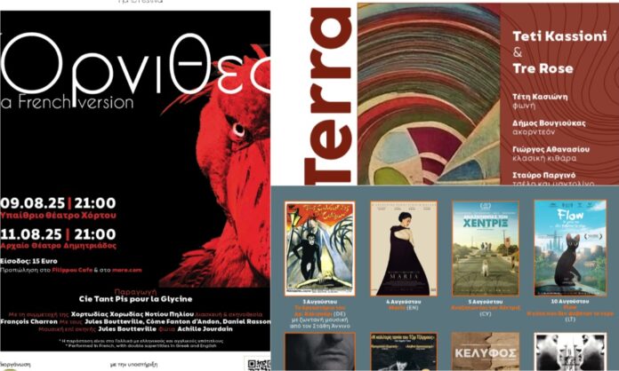 Ειδικότερα, το Σάββατο 9 Αυγούστου στις 21:00 στο θέατρο Χόρτου θα παρουσιαστεί η κωμωδία «Όρνιθες» στα γαλλικά με υπέρτιτλους. Πρόκειται για τη θεατρική προσαρμογή της κωμωδίας του Αριστοφάνη παραγωγής της γαλλικής ομάδας Cie Tant Pis pour la Glycine σε σκηνοθεσία François Charron. Η παράσταση θα ανέβει και τη Δευτέρα 11 Αυγούστου στις 21:00 στο Αρχαίο Θέατρο Δημητριάδας.