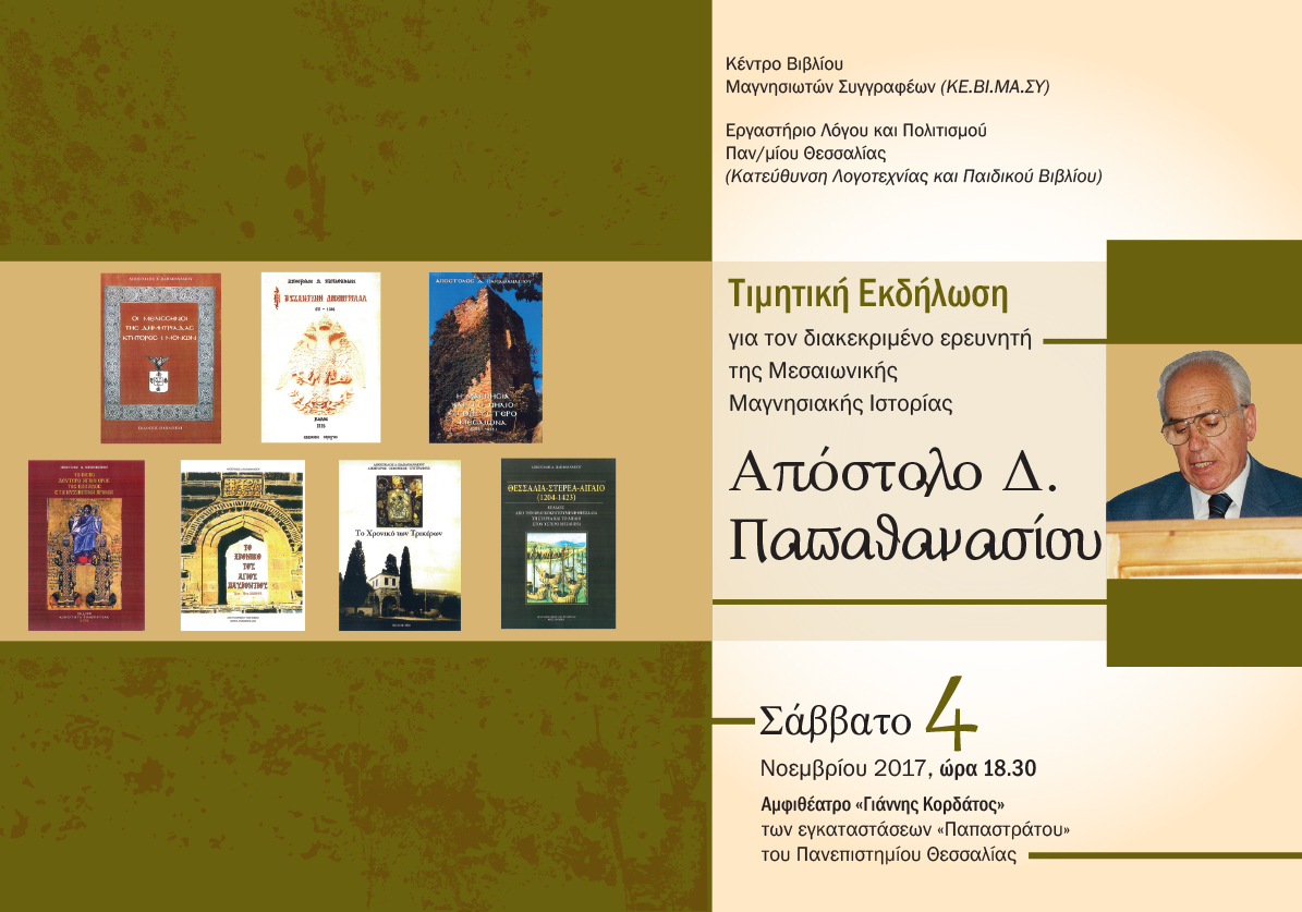Το Κέντρο Βιβλίου Μαγνησιωτών Συγγραφέων και το Εργαστήριο λόγου και Πολιτισμού του Πανεπιστημίου Θεσσαλίας (κατεύθυνση Λογοτεχνίας και Παιδικού Βιβλίου) και οι παρακάτω αναγραφόμενοι συνδιοργανωτές πνευματικοί φορείς του Βόλου γνωστοποίησαν την τιμητική εκδήλωση για τον διακεκριμένο ερευνητή της «Μεσαιωνικής Μαγνησιακής Ιστορίας» Απόστολο Δ. Παπαθανασίου το Σάββατο 4 Νοεμβρίου, ώρα 18.30 στο Αμφιθέατρο “Γιάννης Κορδάτος” των εγκαταστάσεων “Παπαστράτου” του Πανεπιστημίου Θεσσαλίας.