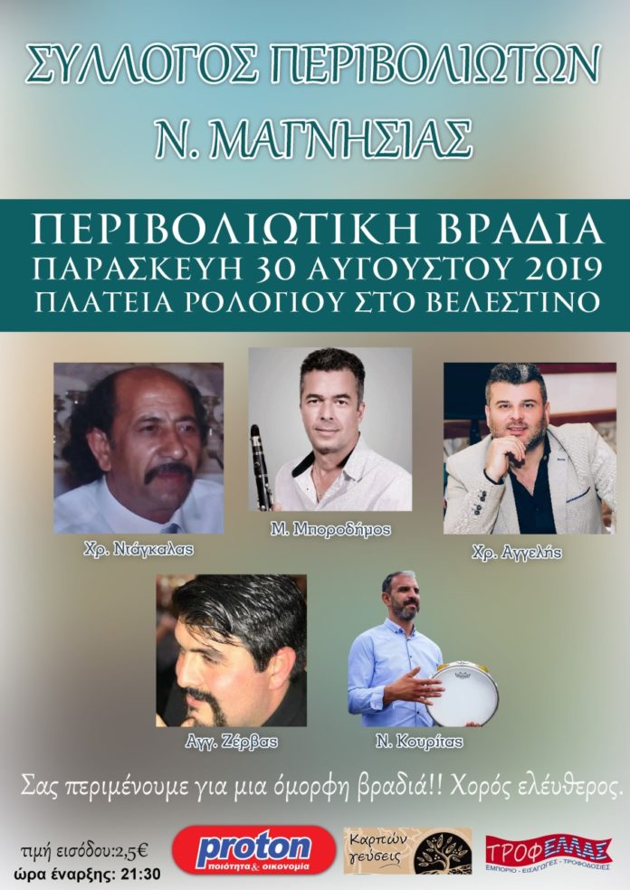 Περιβολιώτικη βραδιά από τον σύλλογο Περιβολιωτών Ν. Μαγνησίας θα πραγματοποιηθεί την Παρασκευή 30 Αυγούστου 2019 και ώρα 21.30 στην πλατεία Ρολογιού στο Βελεστίνο. Την εκδήλωση θα πλαισιώσουν οι μουσικοί : Χρ. Ντάγκαλας, Μ. Μποροδήμος, Χρ. Αγγελής, Αγγ. Ζέρβας και Ν. Κουρίτας. Η εκδήλωση πραγματοποιείται στα πλαίσια των καλοκαιρινών εκδηλώσεων του δήμου Ρήγα Φεραίου.