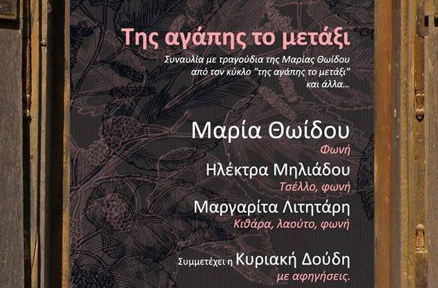 «Της αγάπης το μετάξι» είναι ο τίτλος συναυλίας με τραγούδια της Μαρίας Θωίδου, που θα πραγματοποιηθεί στο «Μουσείο Ελιάς και Λαδιού Πηλίου», την Κυριακή 4 Σεπτεμβρίου, στις 8:00 μ.μ.