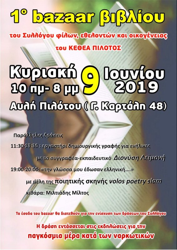 Ο Σύλλογος Οικογένειας, Εθελοντών και Φίλων του ΚΕΘΕΑ Πιλότος στο Βόλο προχωρά στη διοργάνωση του 1ου Μπαζάρ Βιβλίου την ερχόμενη Κυριακή 9 Ιουνίου 2019.
