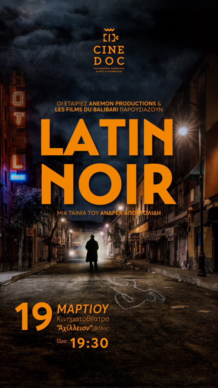 Το φεστιβάλ ντοκιμαντέρ CineDoc Βόλου επιστρέφει δυναμικά το Σάββατο 19 Μαρτίου, ώρα 19.30, στον κινηματογράφο «Αχίλλειον» με το πολυαναμενόμενο ντοκιμαντέρ «Latin Noir» του συγγραφέα, μεταφραστή και σκηνοθέτη Ανδρέα Αποστολίδη (2020), σε συνδιοργάνωση με τη Διεύθυνση Πολιτισμού του ΔΟΕΠΑΠ-ΔΗΠΕΘΕ του Δήμου Βόλου. Όπως αναφέρεται σε σχετική ανακοίνωση είναι ένα κινηματογραφικό ντοκιμαντέρ μεγάλου μήκους που αναζητά τη σύνδεση ανάμεσα στις αυταρχικές κυβερνήσεις και το αστυνομικό μυθιστόρημα στη Λατινική Αμερική.