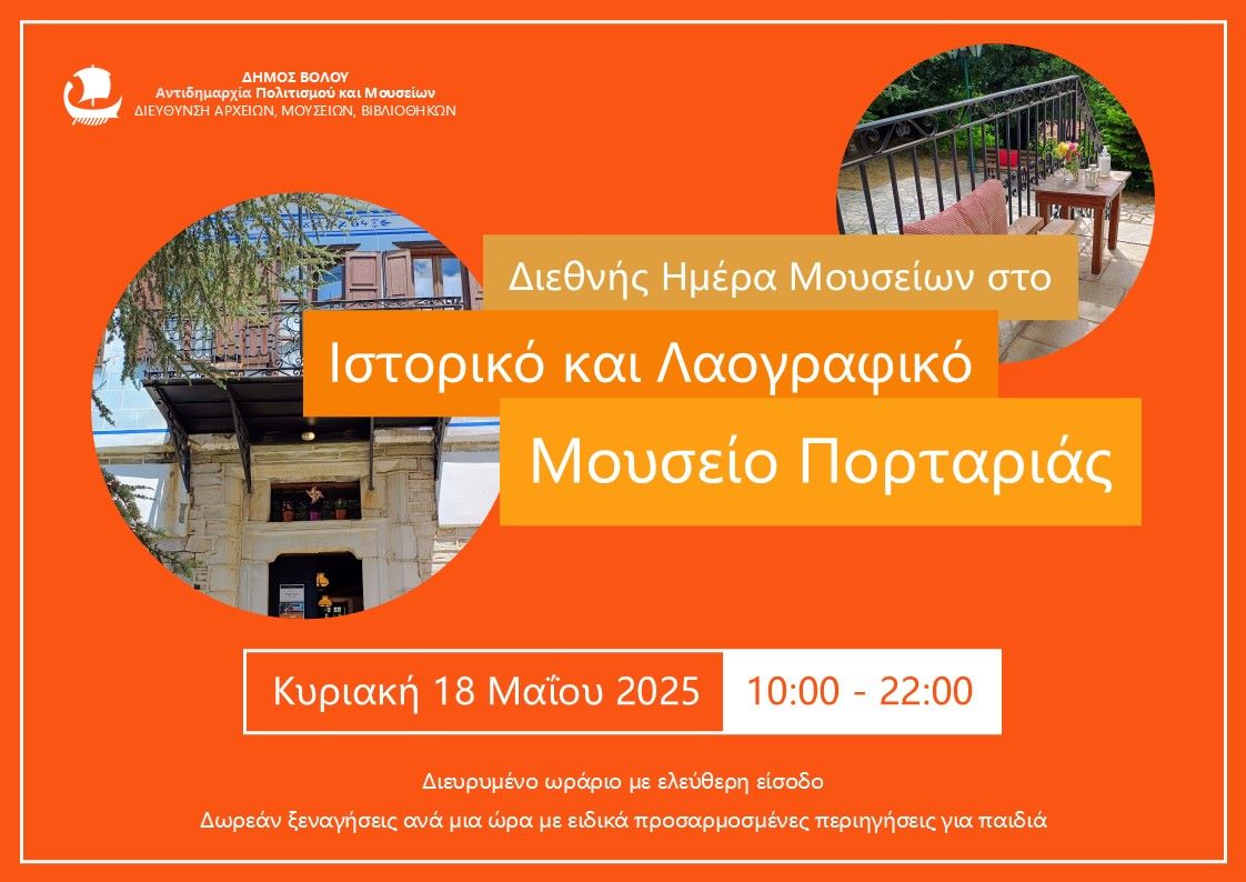 H Διεύθυνση Αρχείων, Μουσείων και Βιβλιοθηκών, με αφορμή τον εορτασμό της Διεθνούς Ημέρας Μουσείων 2025, με θέμα «Μουσεία και κοινωνίες σε διαρκή αλλαγή», προσκαλεί τους ενδιαφερόμενους να ανακαλύψουν την ιδιαίτερη ιστορία της Πορταριάς, μέσα από τα εκθέματα του Ιστορικού και Λαογραφικού Μουσείου Πορταριάς. Την Κυριακή 18 Μαΐου, με διευρυμένο ωράριο και ελεύθερη είσοδο, από τις 10 π.μ. μέχρι και τις 10 μ.μ.