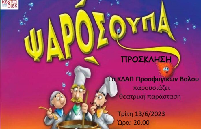 Το ΚΔΑΠ Προσφυγικών παρουσιάζει τη θεατρική παράσταση για μικρούς και μεγάλους «Ψαρόσουπα», του Γ. Λεμπέση, από το τμήμα θεατρικής αγωγής ,που θα πραγματοποιηθεί στον προαύλιο χώρο του Κ.Δ.Α.Π. την Τρίτη 13 Ιουνίου στις 20:00.