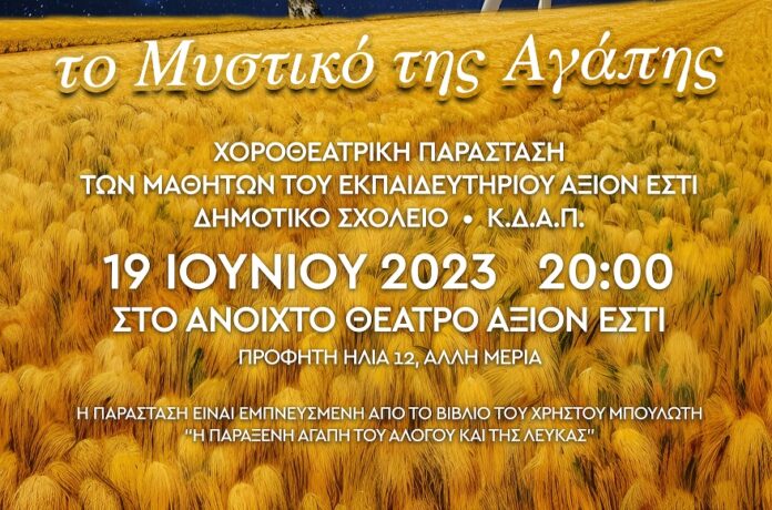 Τα παιδιά εκφράζονται μέσα από τον χορό, την μουσική και τον λόγοκαι φωνάζουν δυνατά το μυστικό της αγάπης στην καλοκαιρινή μουσικοχοροθεατρική τους παράσταση «Το Μυστικό της Αγάπης» η οποία θα πραγματοποιηθεί στο αμφιθέατρο του άξιον εστί την Δευτέρα 19 Ιουνίου 2023 και ώρα 8 μ.μ..