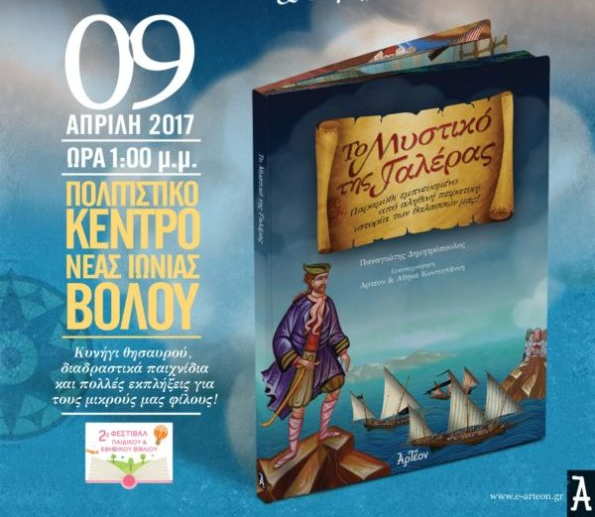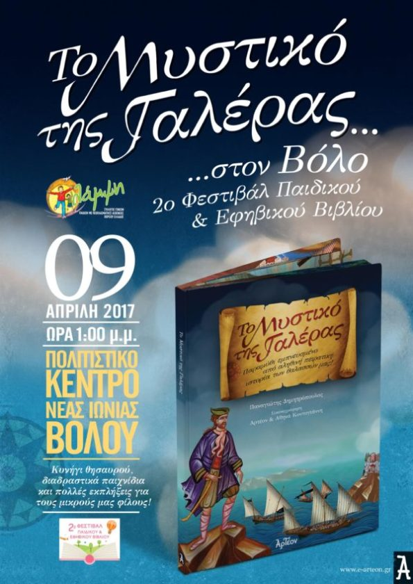 Η «Αρτέον Εκδοτική» συμμετέχει με το παραμύθι του Παναγιώτη Δημητρόπουλου «Το μυστικό της γαλέρας» στο «2ο Φεστιβάλ Παιδικού & Εφηβικού Βιβλίου» που διοργανώνει η Ένωση Συλλόγων Γονέων και Κηδεμόνων Δ. Βόλου, στον Βόλο, στις 9 Απριλίου 2017 και ώρα 1:00 μ.μ.