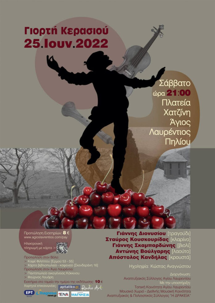 Ο Αναπτυξιακός Σύλλογος Αγίου Λαυρεντίου θα υποδεχθεί και φέτος ντόπιους και επισκέπτες στη Γιορτή Κερασιού το Σάββατο 25 Ιουνίου 2022 στις 21:00, στην πλατεία Χατζίνη, ατενίζοντας το βουνό που έθρεψε τόσες κερασιές κι άλλους τόσους ανθρώπους. Στην γιορτή θα τραγουδήσει ο σπουδαίος μουσικός κι ερμηνευτής Γιάννης Διονυσίου, ο διακεκριμένος δεξιοτέχνης του κλαρίνου Σταύρος Κουσκουρίδας και μια σειρά σπουδαίων μουσικών.