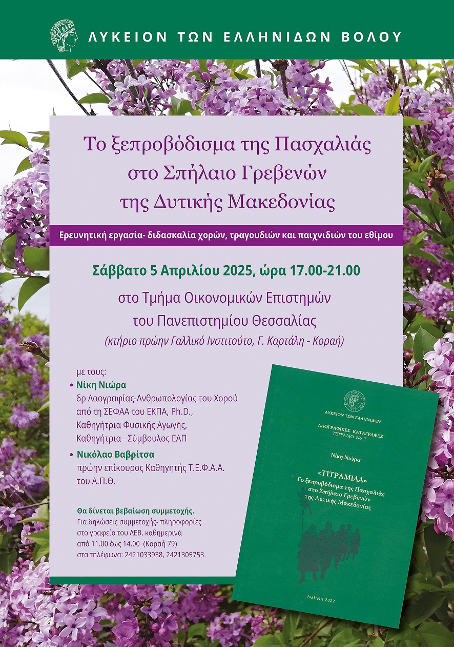 Το Λύκειο των Ελληνίδων Βόλου παρουσιάζει ένα ξεχασμένο λαϊκό δρώμενο, με εκπαιδευτικό περιεχόμενο: το ξεπροβόδισμα της Πασχαλιάς στο Σπήλαιο Γρεβενών της Δυτικής Μακεδονίας, που περιλαμβάνει ερευνητική εργασία, διδασκαλία χορών, τραγουδιών και παιχνιδιών του εθίμου. Η παρουσίαση θα πραγματοποιηθεί το Σάββατο 5 Απριλίου, στο Τμήμα Οικονομικών Επιστημών του Πανεπιστημίου Θεσσαλίας (κτήριο πρώην Γαλλικό Ινστιτούτο, Γ. Καρτάλη – Κοραή) και θα διαρκέσει από τις 17.00 έως τις 21.00.