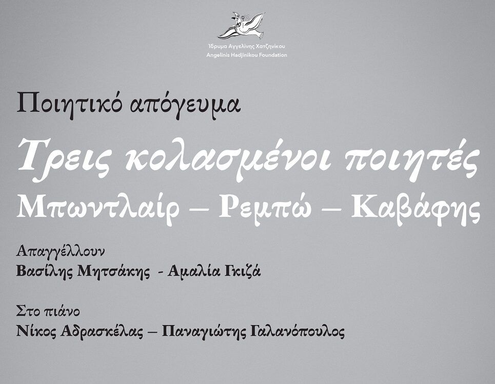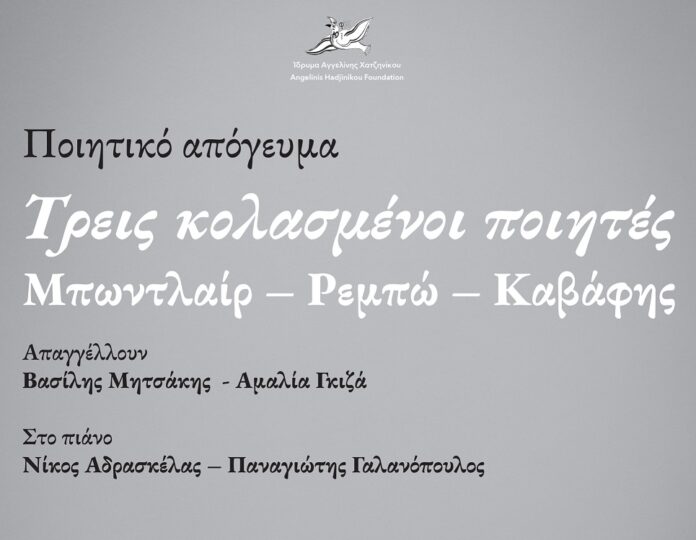 Την Κυριακή 30 Μαρτίου στις 7 το απόγευμα , στο Αρχοντικό «Ταξίμι» στην Αργαλαστή και υπό την αιγίδα του Ιδρύματος Αγγελίνη – Χατζηνίκου, ο Βασίλης Μητσάκης και η Αμαλία Γκίζα, με τους Νίκο Αδρασκέλα και Παναγιώτη Γαλανόπουλο στο πιάνο, θα παρουσιάσουν την παράσταση «Τρεις Κολασμένοι Ποιητές: Μπωντλαίρ- Ρεμπώ- Καβάφης».
