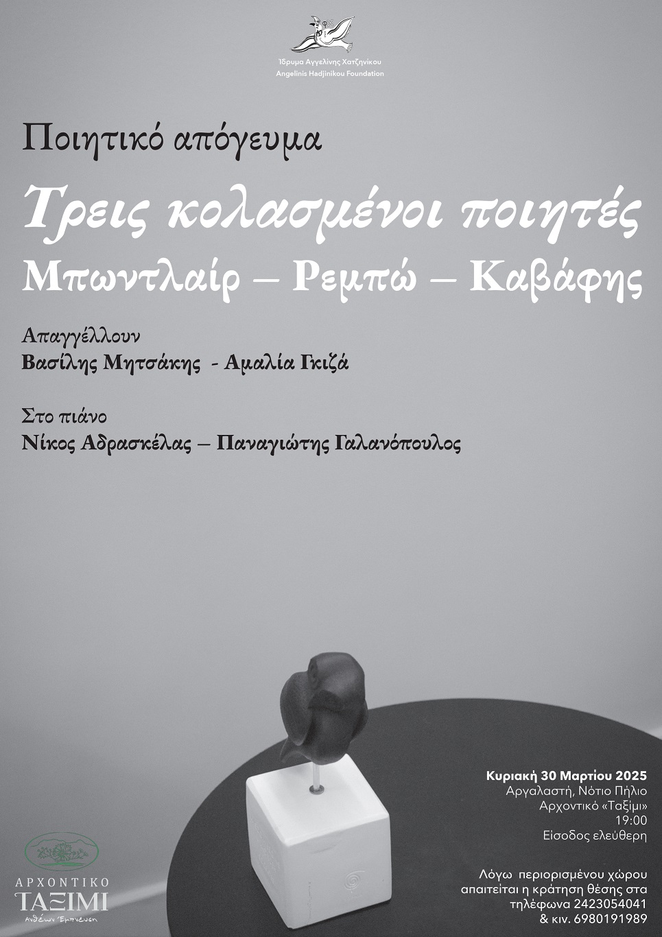 Την Κυριακή 30 Μαρτίου στις 7 το απόγευμα , στο Αρχοντικό «Ταξίμι» στην Αργαλαστή και υπό την αιγίδα του Ιδρύματος Αγγελίνη – Χατζηνίκου, ο Βασίλης Μητσάκης και η Αμαλία Γκίζα, με τους Νίκο Αδρασκέλα και Παναγιώτη Γαλανόπουλο στο πιάνο, θα παρουσιάσουν την παράσταση «Τρεις Κολασμένοι Ποιητές: Μπωντλαίρ- Ρεμπώ- Καβάφης».