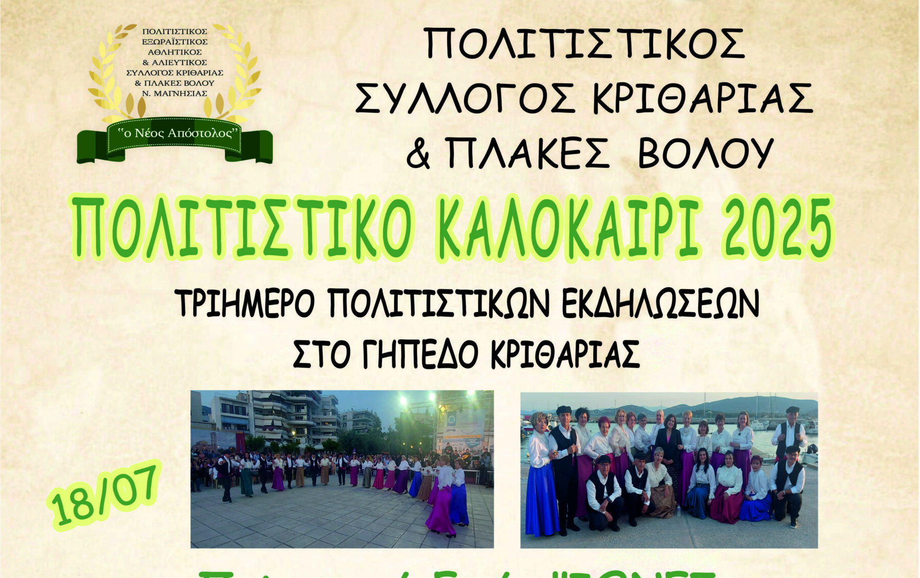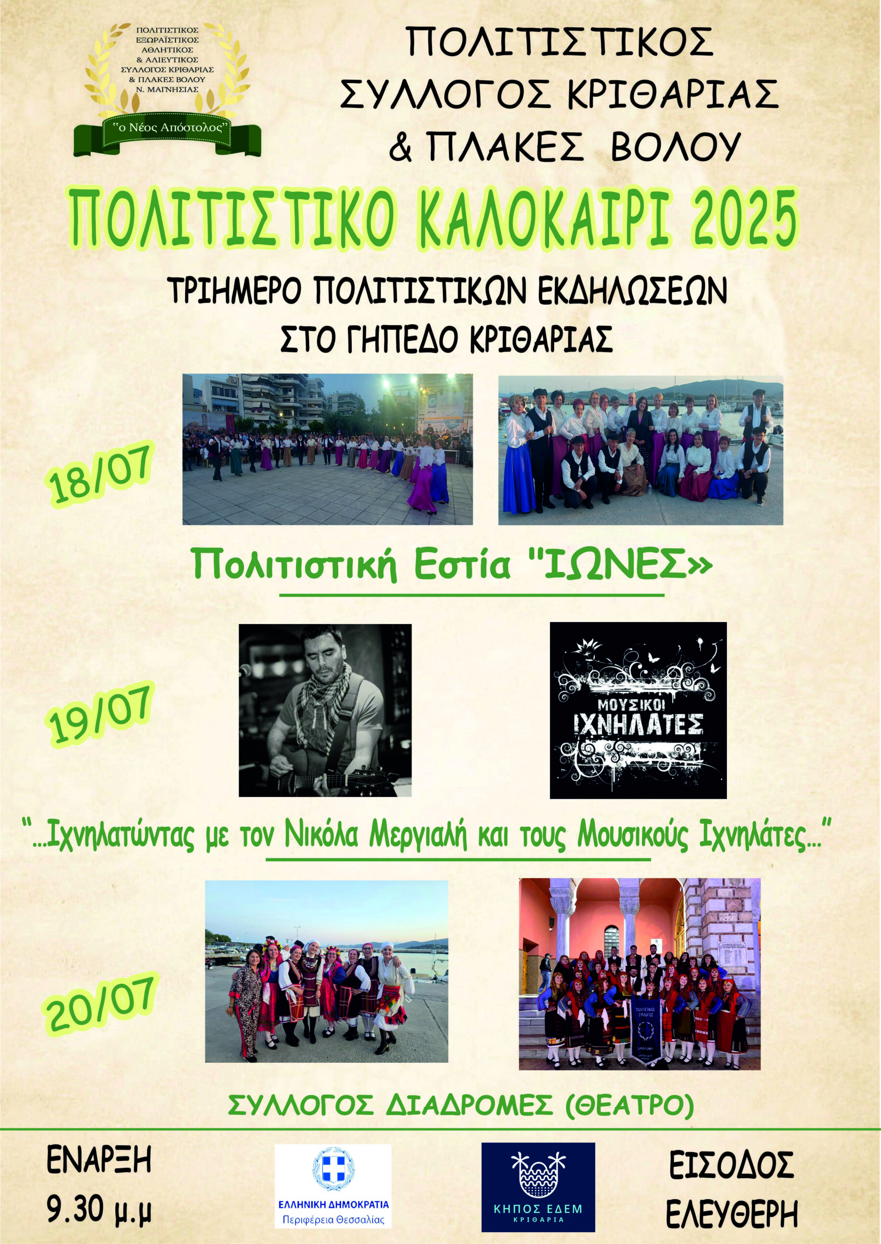 Τριήμερο πολιτιστικών εκδηλώσεων διοργανώνει ο Πολιτιστικός Σύλλογος Κριθαριάς & Πλακών Βόλου στις 18,19 και 20 Ιουλίου.