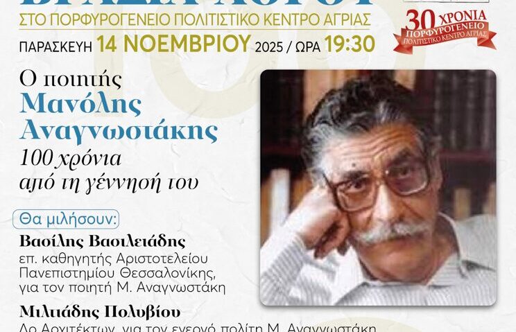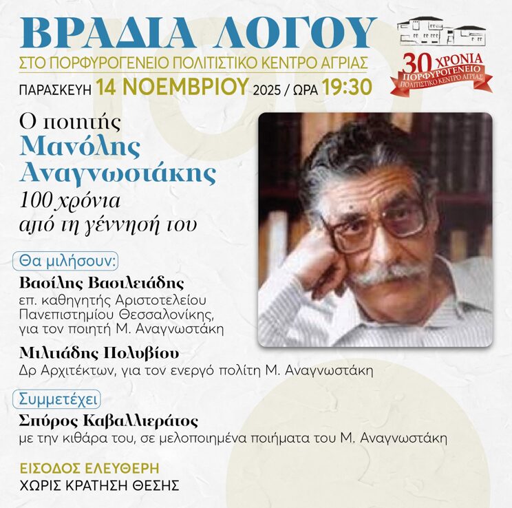 Ένα αφιέρωμα στον σπουδαίο Έλληνα ποιητή και στοχαστή Μανόλη Αναγνωστάκη για τα 100 χρόνια από τη γέννησή του πραγματοποιείται στο Πορφυρογένειο Αγριάς, την Παρασκευή 14 Νοεμβρίου στις 19:30, με καλεσμένους δύο διακεκριμένους μελετητές του έργου του, τον Μιλτιάδη Πολυβίου, Δρ. Αρχιτεκτονικής, στενό φίλο του ποιητή και τον Βασίλη Βασιλειάδη, επ. καθηγητή του Αριστοτελείου Πανεπιστημίου Θεσσαλονίκης.