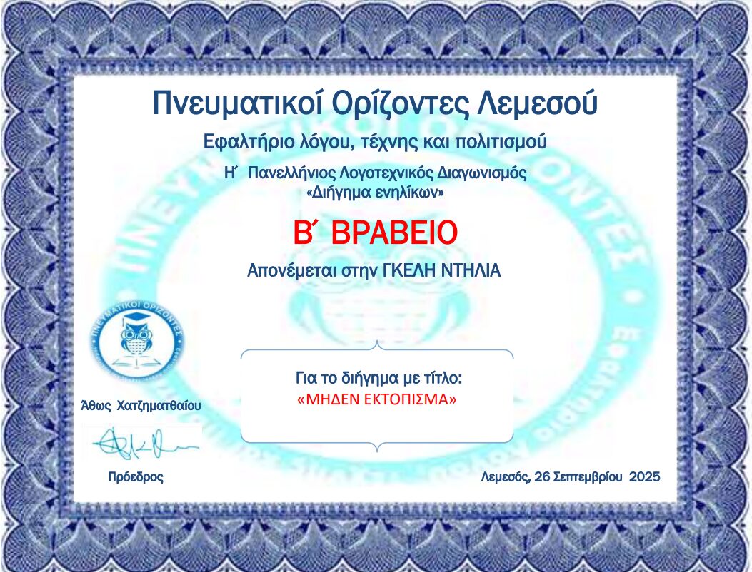 Το διήγημα της Γκέλης Ντηλιά, Καθηγήτριας Αγγλικών, Ποιήτριας-Συγγραφέα και Εθελόντριας Σωφρονιστικών Καταστημάτων, που ζει και εργάζεται εδώ και χρόνια στον Βόλο, με τίτλο «Μηδέν εκτόπισμα» απέσπασε το Β’ Βραβείο στην κατηγορία «Διήγημα ενηλίκων». Επίσης η συμμετοχή της στην κατηγορία «Χαϊκού» απέσπασε Έπαινο.