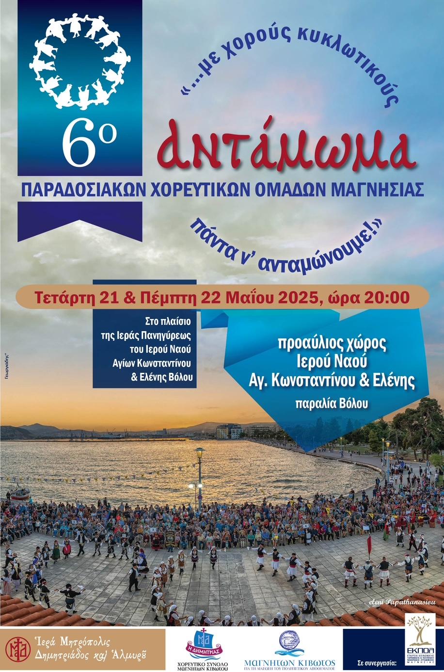 Το 6ο Αντάμωμα Παραδοσιακών Χορευτικών Ομάδων Μαγνησίας θα πραγματοποιηθεί και φέτος στον Ιερό Ναό Αγίου Κωνσταντίνου και Ελένης Βόλου στην παραλία, στο πλαίσιο της πανηγύρεως των Αγίων και των θρησκευτικών εκδηλώσεων που έχουν προγραμματιστεί.