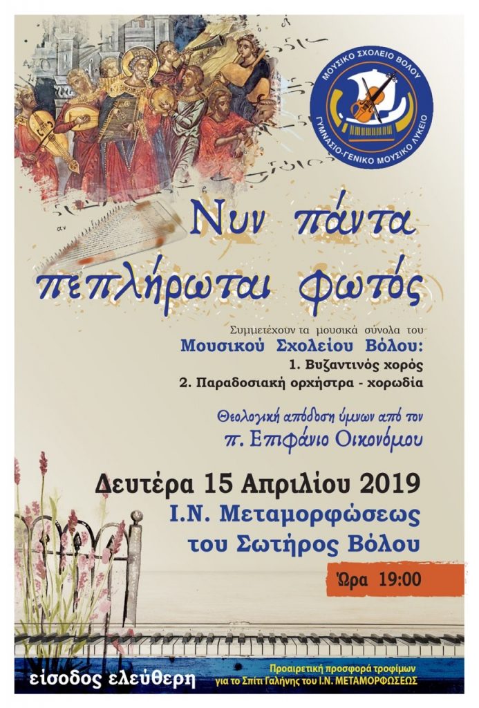 Το Μουσικό Σχολείο Βόλου, στο πλαίσιο του πολιτιστικού προγράμματος «Ύμνοι και σκοποί της Μεγάλης Σαρακοστής», διοργανώνει εκδήλωση, με τίτλο «Νυν πάντα πεπλήρωται φωτός». Η υμνογραφία συναντά τον βυζαντινό χορό και την παραδοσιακή φωνητική και οργανική μουσική – με την σύμπραξη των μουσικών συνόλων του Βυζαντινού χορού, υπό την διεύθυνση του καθηγητού κ. Ευάγγελου Παυλίδη, της παραδοσιακής ορχήστρας, υπό την διεύθυνση του καθηγητού κ. Κωνσταντίνου Γεδίκη και της παραδοσιακής χορωδίας, υπό την καθοδήγηση των καθηγητριών κ.κ. Λυγερής Βλαχογιάννη και Μαρίας Νάκου.