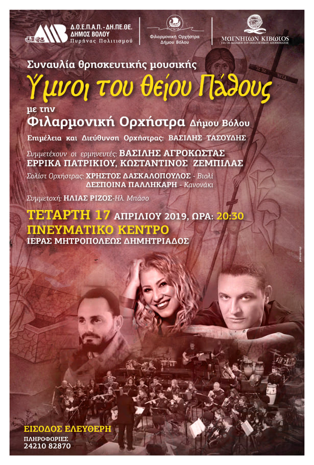 συνδιοργανώνουν την συναυλία θρησκευτικής μουσικής «Ύμνοι του Θείου Πάθους», με την Φιλαρμονική Δήμου Βόλου. Η συναυλία θα πραγματοποιηθεί την Τετάρτη 17 Aπριλίου, στις 8.30 μ.μ., στο Πνευματικό Κέντρο της Ιεράς Μητροπόλεως Δημητριάδος, με είσοδο ελεύθερη για το κοινό.