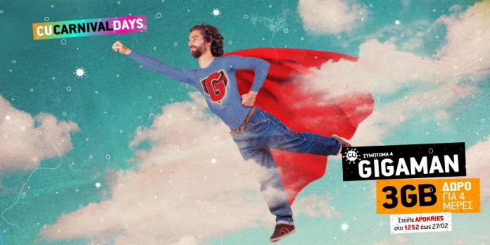 Το CU προσφέρει στους συνδρομητές του έως και τις 27 Φεβρουαρίου δωρεάν 3 GB για 4 ημέρες από τη στιγμή της ενεργοποίησης. Οι CU συνδρομητές μπορούν να αποκτήσουν το δώρο τους μέσα από το CU App, στέλνοντας τη λέξη ΑPOKRIES με ένα SMS στο 1252 ή καλώντας δωρεάν στο ίδιο νούμερο.
