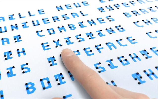 Όπως εξηγεί, η γραμματοσειρά Braille Neue κάνει τον κώδικα Braille εύκολο στη χρήση και από ανθρώπους που βλέπουν.