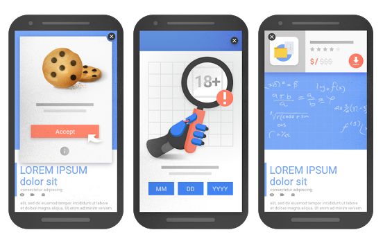 Τρία χαρακτηριστικά παραδείγματα pop up που δεν θα υποβαθμίζουν τη θέση ενός δικτυακού τόπου στα αποτελέσματα της Google από smartphone/tablet, παρά το γεγονός ότι στις δύο πρώτες περιπτώσεις επικαλύπτουν σχεδόν ή εξ ολοκλήρου το κυρίως περιεχόμενο. Στο τρίτο παράδειγμα, ένα pop up με «λογικό» μέγεθος κατά την Google.