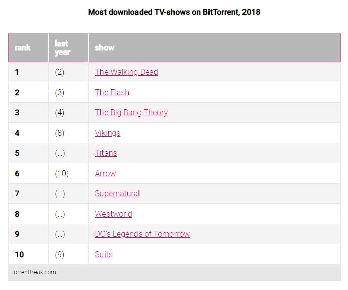 Την κορυφή κατέκτησε η σειρά “The Walking Dead”, η οποία βρισκόταν στη δεύτερη θέση τις προηγούμενες χρονιές. Τα επεισόδια του The Walking Dead έχουν κατέβει εκατομμύρια φορές, καθώς η σειρά βρίσκεται πλέον στην ένατη σεζόν της. Η σειρά, η οποία βασίζεται σε κόμικ, θα συνεχίσει την πορεία της, αφού οι παραγωγοί της έχουν αναφέρει ότι σκοπεύουν να τη συνεχίσουν για αρκετές ακόμη σεζόν.