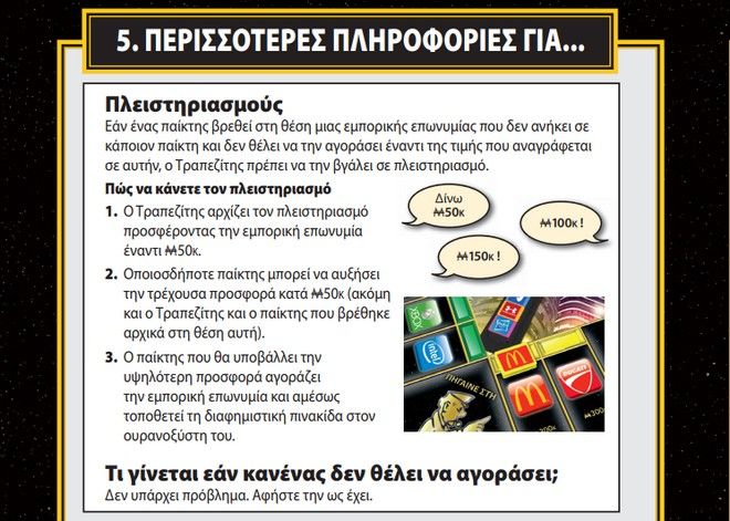Έρχεται η σειρά σας να παίξετε και ρίχνεται το ζάρι. Το πιόνι σας πέφτει σε μια ιδιοκτησία που δεν ανήκει σε κανέναν. Τι κάνετε; Αν επιθυμείτε να την αγοράσετε, ο κόσμος της Μονόπολη μένει όπως τον γνωρίζαμε πάντα. Από την άλλη, όταν δεν έχετε χρήματα ή διάθεση για αγορά το πράγμα περιπλέκεται. Η τράπεζα οφείλει να βγάλει την ιδιοκτησία σε πλειστηριασμό και οι υπόλοιποι παίκτες μπορούν να ποντάρουν προκειμένου να την αποκτήσουν.